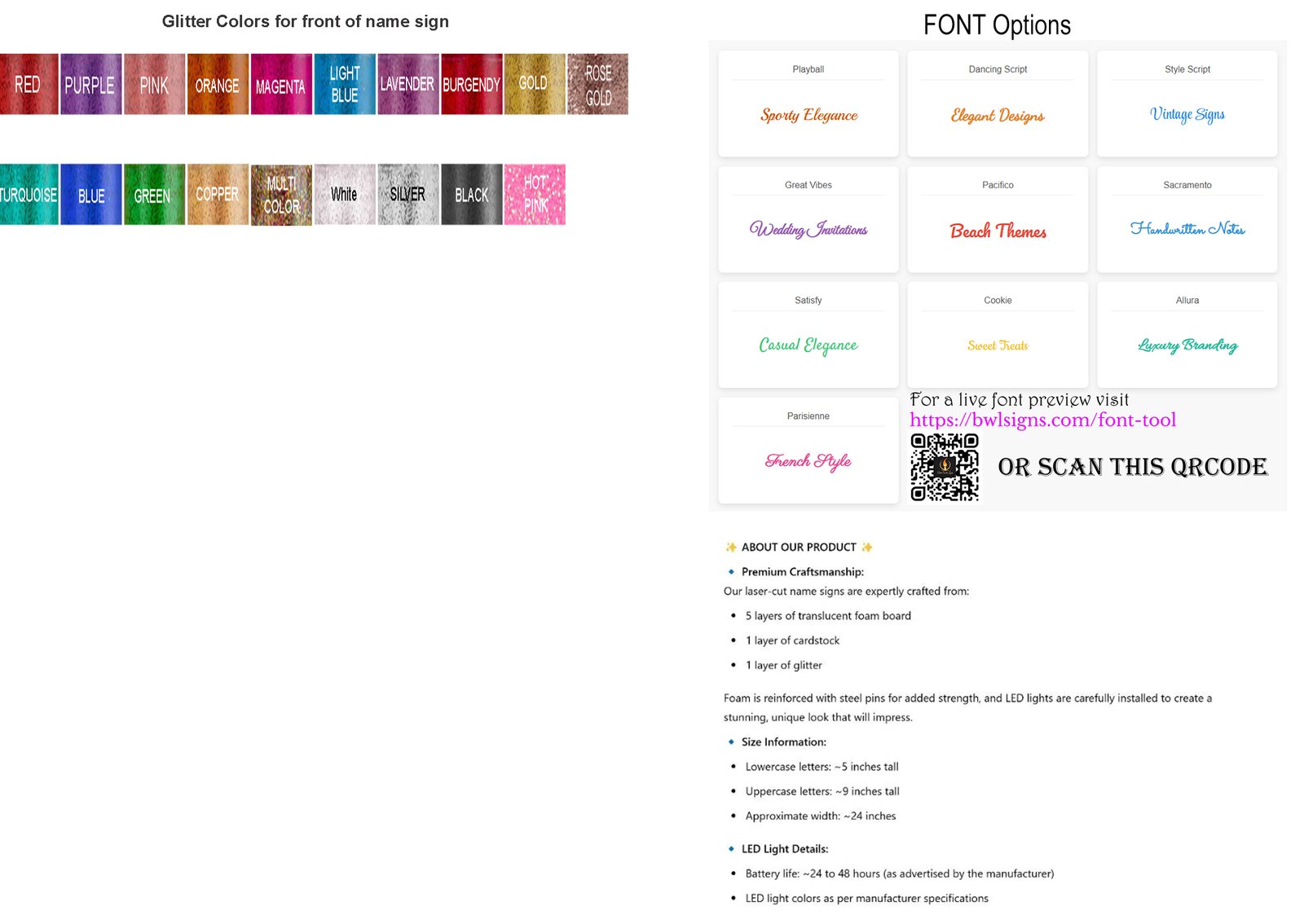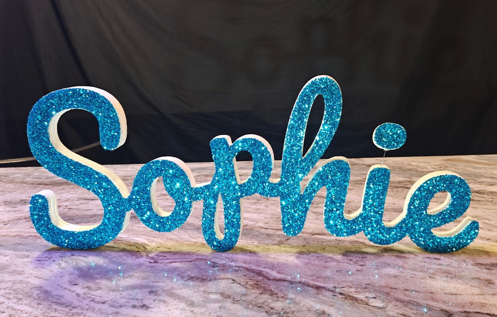 Custom LED-lit name sign made of layered foam board, reinforced for durability. Great for Sweet 16s, Mitzvahs, Quinceañeras & more. (Base not included)